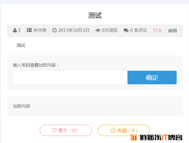 /* Name: 部分内容输入密码可见(短代码) * 作者:E享乐(www.exiang2.com) */ function e_secret($atts, $content=null){ extract(shortcode_atts(array('key'=>null), $atts)); if(isset($_POST['e_secret_key']) && $_POST['e_secret_key']==$key){ return ' <div class="e-secret">'.$content.'</div> '; } else{ return ' <form class="e-secret" action="'.get_permalink().'" method="post" name="e-secret"><label>输入密码查看加密内容:</label><input type="password" name="e_secret_key" class="euc-y-i" maxlength="50"><input type="submit" class="euc-y-s" value="确定"> <div class="euc-clear"></div> </form> '; } } add_shortcode('secret','e_secret');