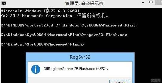 6、再输入regsvr32 Flash.ocx后,按下回车键;