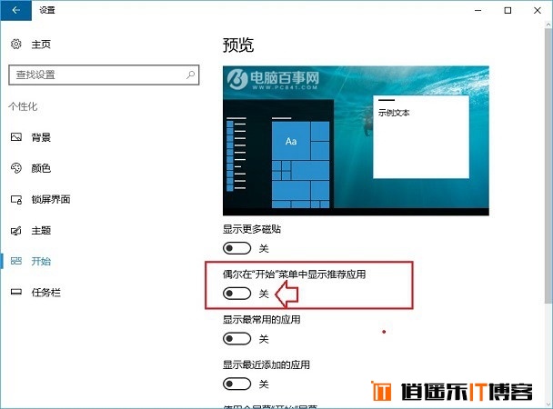 同样是点击Win10左下角的开始菜单图标,然后点击进入“设置”→“个性化”→“开始”标签下的“偶尔在’开始’菜单中显示推荐应用”的复选框关闭即可,如下图所示。