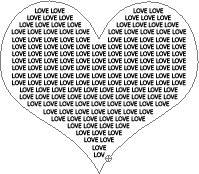 | 4、现在我们先将文字工具停留在心形之内(光标为),然后单击,出现文字输入光标,输入一些文字。如“LOVE”(注意每个字母之后都有一个空格,原因稍后再述)。选择一个英文字体(如Tohoma),选择小一些的字号(如6px),并复制粘贴几次,使其充满整个图形(超出也没有关系),效果如下左图。此时看到文字在图形内的排列并不对称,接下来在段落调板中设置居中,并适当设置左缩进和右缩进的数值(如5px),这样看上去就较为舒适了。一般来说在封闭图形内排版文字,都要进行这些设定以达到较好的视觉效果。如下右图。 |
