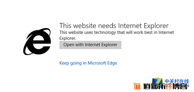 当我们尝试使用Edge打开国内几大银行的官网时,Edge直接显示的就是IE的跳转页面,提示我们使用IE来打开这些网页。