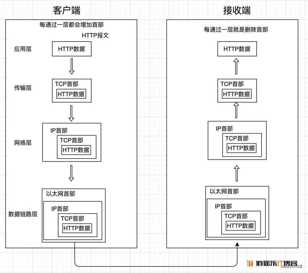 TCP/IP 协议进行通信时,会通过分层顺序和对方进行通信。客户端从应用层往下走,服务器端则从链路层往上走。看下面的图。