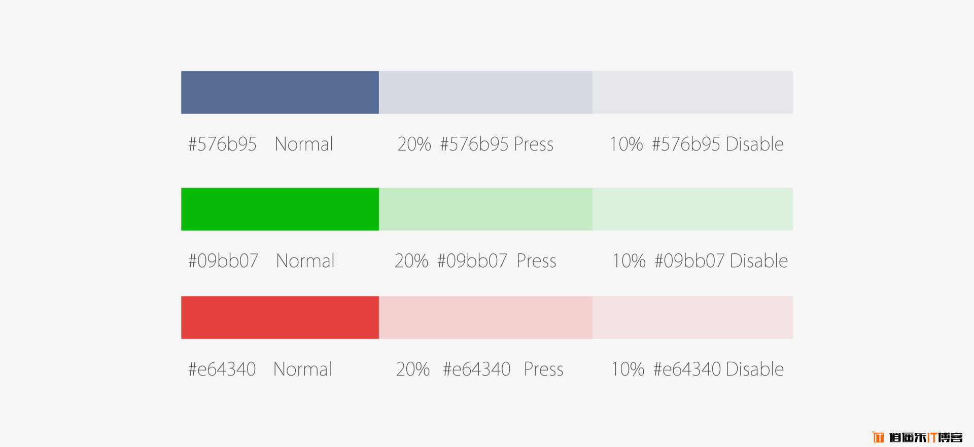 蓝色为链接用色,绿色为完成字样色,红色为出错用色 Press 与 Disable 状态分别降低透明度为20%与10%。